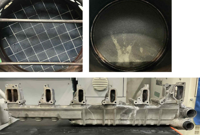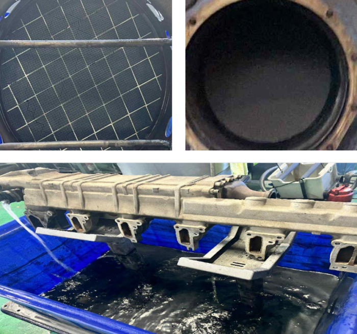 ・EGRを高圧洗浄機にて水洗い後、EGR洗浄槽へ入れる。6時間の洗浄後、今度は洗浄槽に浸かっていなかった部分を逆にして浸す。6時間の洗浄後、高圧洗浄機にて水洗。水洗い後、大型水槽にてエアー漏れがないかリークテストをする。エアー漏れがないことを確認して完了。